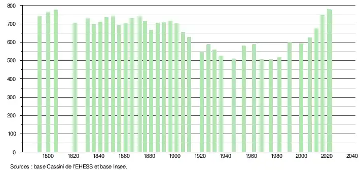 - ↑ Population municipale de référence en vigueur au 1er janvier 2025, millésimée 2022, définie dans les limites territoriales en vigueur au 1er janvier 2024, date de référence statistique : 1er janvier 2022.