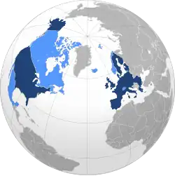 L'influence des États-Unis s'est étendue en Europe lors de l'effondrement de l'Union Soviétique perçu comme la fin de la Guerre Froide. L'extension de cette influence transparait avec l'adhésion de tous[note 2] les anciens pays d'Europe de l'Est, précédemment vassaux de l'Union Soviétique dans le pacte de Varsovie, qui rejoignent l'OTAN symbole de la protection avec les États-Unis contre la perception d'une menace russe. Cette extension agrandi l'OTAN, qui a non seulement survécu à son rôle historique (assurer la défense du « monde libre » face au communisme)[11].