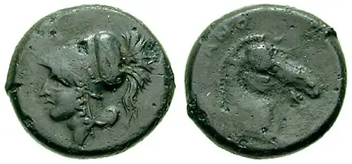 - Les monnaies du type Mars présentent sur le droit la tête de la divinité barbue et casquée et sur le revers une tête de cheval avec harnais positionné sur un dauphin nageur.
