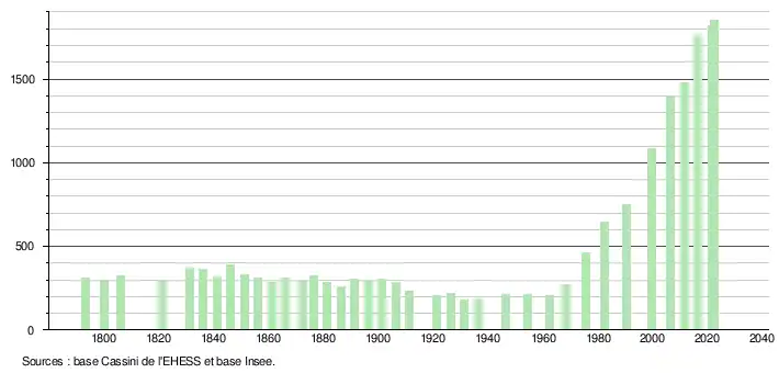 L'évolution du nombre d'habitants est connue à travers les recensements de la population effectués dans la commune depuis 1793. Pour les communes de moins de 10 000 habitants, une enquête de recensement portant sur toute la population est réalisée tous les cinq ans, les populations de référence des années intermédiaires étant quant à elles estimées par interpolation ou extrapolation[27]. Pour la commune, le premier recensement exhaustif entrant dans le cadre du nouveau dispositif a été réalisé en 2006[28].