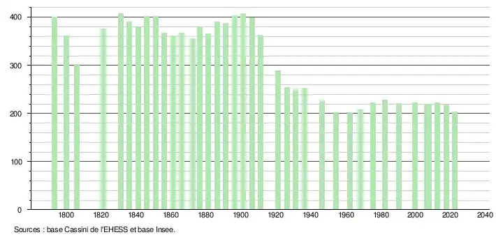 L'évolution du nombre d'habitants est connue à travers les recensements de la population effectués dans la commune depuis 1793. Pour les communes de moins de 10 000 habitants, une enquête de recensement portant sur toute la population est réalisée tous les cinq ans, les populations de référence des années intermédiaires étant quant à elles estimées par interpolation ou extrapolation[15]. Pour la commune, le premier recensement exhaustif entrant dans le cadre du nouveau dispositif a été réalisé en 2007[16].
