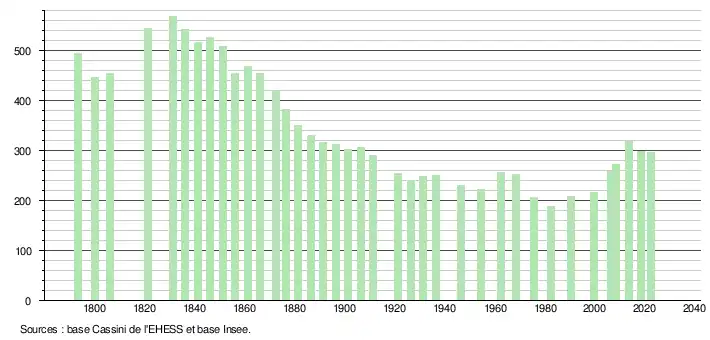 L'évolution du nombre d'habitants est connue à travers les recensements de la population effectués dans la commune depuis 1793. Pour les communes de moins de 10 000 habitants, une enquête de recensement portant sur toute la population est réalisée tous les cinq ans, les populations de référence des années intermédiaires étant quant à elles estimées par interpolation ou extrapolation[35]. Pour la commune, le premier recensement exhaustif entrant dans le cadre du nouveau dispositif a été réalisé en 2008[36].