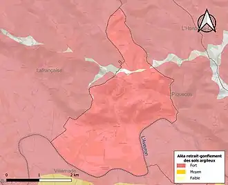 Le retrait-gonflement des sols argileux est susceptible d'engendrer des dommages importants aux bâtiments en cas d’alternance de périodes de sécheresse et de pluie. 99,1 % de la superficie communale est en aléa moyen ou fort (92 % au niveau départemental et 48,5 % au niveau national). Sur les 135 bâtiments dénombrés sur la commune en 2019, 134 sont en aléa moyen ou fort, soit 99 %, à comparer aux 96 % au niveau départemental et 54 % au niveau national. Une cartographie de l'exposition du territoire national au retrait gonflement des sols argileux est disponible sur le site du BRGM[28],[Carte 3].