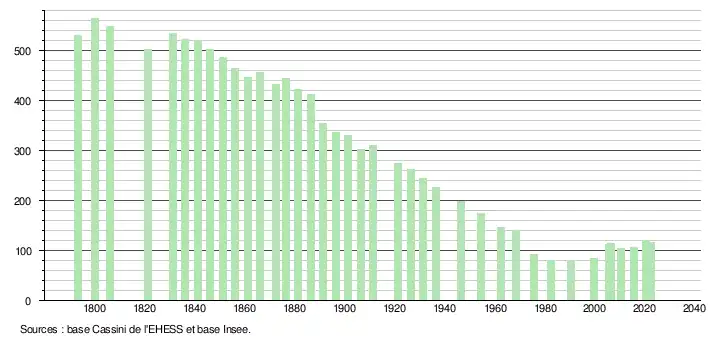 L'évolution du nombre d'habitants est connue à travers les recensements de la population effectués dans la commune depuis 1793. Pour les communes de moins de 10 000 habitants, une enquête de recensement portant sur toute la population est réalisée tous les cinq ans, les populations de référence des années intermédiaires étant quant à elles estimées par interpolation ou extrapolation[19]. Pour la commune, le premier recensement exhaustif entrant dans le cadre du nouveau dispositif a été réalisé en 2005[20].