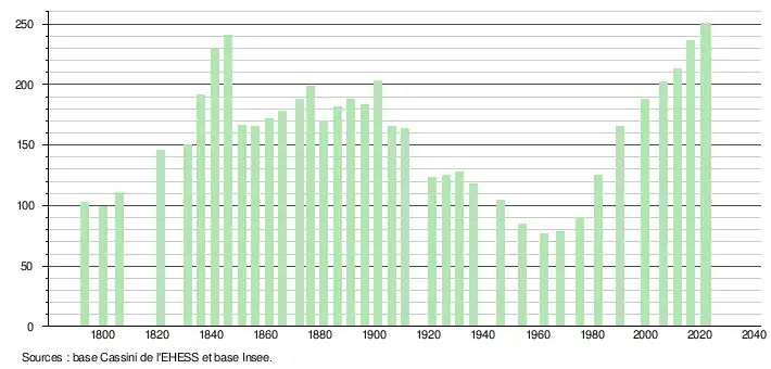 L'évolution du nombre d'habitants est connue à travers les recensements de la population effectués dans la commune depuis 1793. Pour les communes de moins de 10 000 habitants, une enquête de recensement portant sur toute la population est réalisée tous les cinq ans, les populations de référence des années intermédiaires étant quant à elles estimées par interpolation ou extrapolation[25]. Pour la commune, le premier recensement exhaustif entrant dans le cadre du nouveau dispositif a été réalisé en 2006[26].