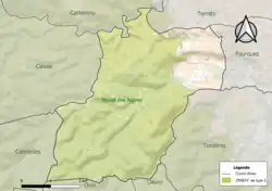 L'occupation des sols de la commune, telle qu'elle ressort de la base de données européenne d’occupation biophysique des sols Corine Land Cover (CLC), est marquée par l'importance des forêts et milieux semi-naturels (77,2 % en 2018), une proportion sensiblement équivalente à celle de 1990 (78 %). La répartition détaillée en 2018 est la suivante : forêts (40,8 %), milieux à végétation arbustive et/ou herbacée (36,4 %), cultures permanentes (16,1 %), zones urbanisées (4,7 %), zones agricoles hétérogènes (2 %)[16]. L'évolution de l’occupation des sols de la commune et de ses infrastructures peut être observée sur les différentes représentations cartographiques du territoire : la carte de Cassini (XVIIIe siècle), la carte d'état-major (1820-1866) et les cartes ou photos aériennes de l'IGN pour la période actuelle (1950 à aujourd'hui)[Carte 4].
