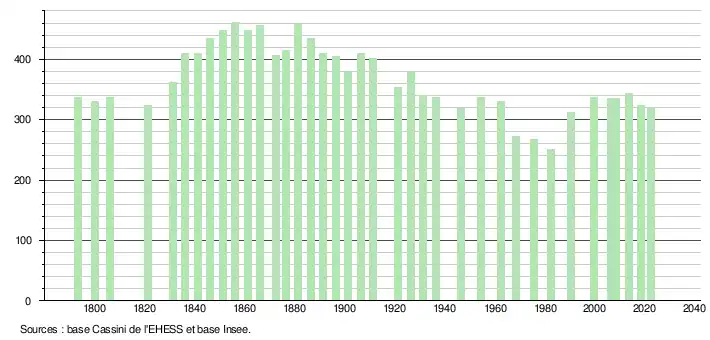 L'évolution du nombre d'habitants est connue à travers les recensements de la population effectués dans la commune depuis 1793. Pour les communes de moins de 10 000 habitants, une enquête de recensement portant sur toute la population est réalisée tous les cinq ans, les populations de référence des années intermédiaires étant quant à elles estimées par interpolation ou extrapolation[46]. Pour la commune, le premier recensement exhaustif entrant dans le cadre du nouveau dispositif a été réalisé en 2008[47].
