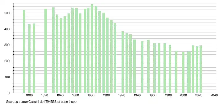 L'évolution du nombre d'habitants est connue à travers les recensements de la population effectués dans la commune depuis 1793. Pour les communes de moins de 10 000 habitants, une enquête de recensement portant sur toute la population est réalisée tous les cinq ans, les populations de référence des années intermédiaires étant quant à elles estimées par interpolation ou extrapolation[16]. Pour la commune, le premier recensement exhaustif entrant dans le cadre du nouveau dispositif a été réalisé en 2007[17].