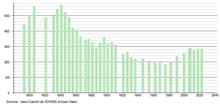 L'évolution du nombre d'habitants est connue à travers les recensements de la population effectués dans la commune depuis 1793. Pour les communes de moins de 10 000 habitants, une enquête de recensement portant sur toute la population est réalisée tous les cinq ans, les populations de référence des années intermédiaires étant quant à elles estimées par interpolation ou extrapolation[28]. Pour la commune, le premier recensement exhaustif entrant dans le cadre du nouveau dispositif a été réalisé en 2007[29].