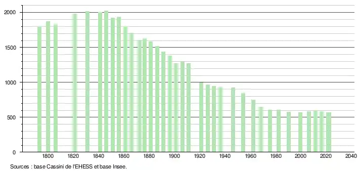 | L'évolution du nombre d'habitants est connue à travers les recensements de la population effectués dans la commune depuis 1793. Pour les communes de moins de 10 000 habitants, une enquête de recensement portant sur toute la population est réalisée tous les cinq ans, les populations de référence des années intermédiaires étant quant à elles estimées par interpolation ou extrapolation[30]. Pour la commune, le premier recensement exhaustif entrant dans le cadre du nouveau dispositif a été réalisé en 2006[31]. En 2022, la commune comptait 569 habitants[Note 5], en évolution de −2,4 % par rapport à 2016 (Gers : +1,04 %, France hors Mayotte : +2,11 %). |