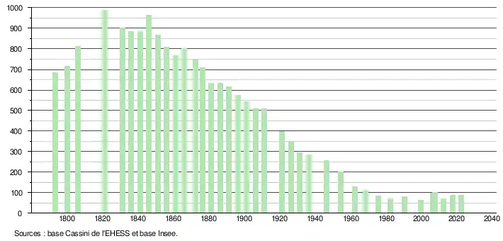 L'évolution du nombre d'habitants est connue à travers les recensements de la population effectués dans la commune depuis 1793. Pour les communes de moins de 10 000 habitants, une enquête de recensement portant sur toute la population est réalisée tous les cinq ans, les populations de référence des années intermédiaires étant quant à elles estimées par interpolation ou extrapolation[35]. Pour la commune, le premier recensement exhaustif entrant dans le cadre du nouveau dispositif a été réalisé en 2007[36].