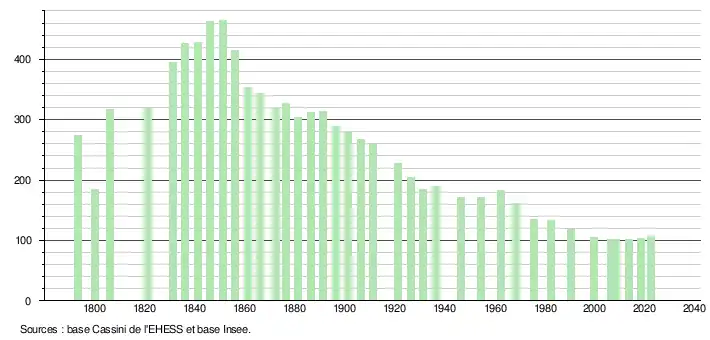 L'évolution du nombre d'habitants est connue à travers les recensements de la population effectués dans la commune depuis 1793. Pour les communes de moins de 10 000 habitants, une enquête de recensement portant sur toute la population est réalisée tous les cinq ans, les populations de référence des années intermédiaires étant quant à elles estimées par interpolation ou extrapolation[31]. Pour la commune, le premier recensement exhaustif entrant dans le cadre du nouveau dispositif a été réalisé en 2008[32].
