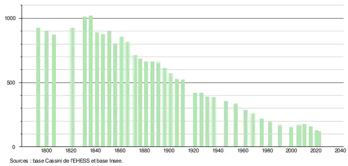 L'évolution du nombre d'habitants est connue à travers les recensements de la population effectués dans la commune depuis 1793. Pour les communes de moins de 10 000 habitants, une enquête de recensement portant sur toute la population est réalisée tous les cinq ans, les populations de référence des années intermédiaires étant quant à elles estimées par interpolation ou extrapolation[21]. Pour la commune, le premier recensement exhaustif entrant dans le cadre du nouveau dispositif a été réalisé en 2005[22].