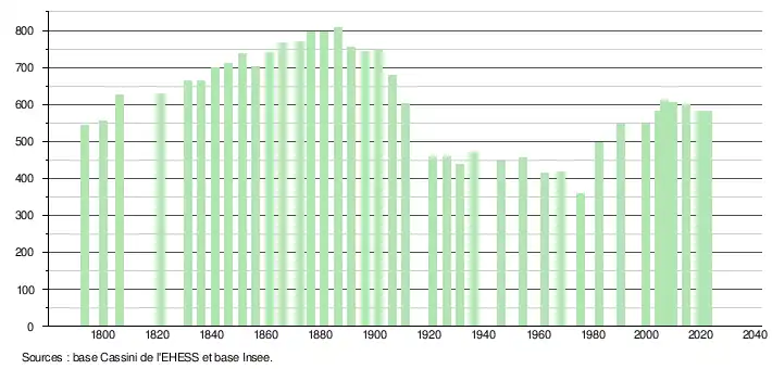 L'évolution du nombre d'habitants est connue à travers les recensements de la population effectués dans la commune depuis 1793. Pour les communes de moins de 10 000 habitants, une enquête de recensement portant sur toute la population est réalisée tous les cinq ans, les populations de référence des années intermédiaires étant quant à elles estimées par interpolation ou extrapolation[16]. Pour la commune, le premier recensement exhaustif entrant dans le cadre du nouveau dispositif a été réalisé en 2004[17].