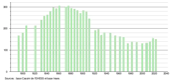 L'évolution du nombre d'habitants est connue à travers les recensements de la population effectués dans la commune depuis 1793. Pour les communes de moins de 10 000 habitants, une enquête de recensement portant sur toute la population est réalisée tous les cinq ans, les populations de référence des années intermédiaires étant quant à elles estimées par interpolation ou extrapolation[23]. Pour la commune, le premier recensement exhaustif entrant dans le cadre du nouveau dispositif a été réalisé en 2007[24].