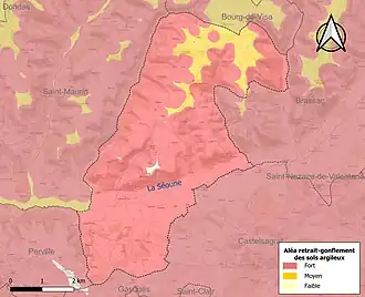 Le retrait-gonflement des sols argileux est susceptible d'engendrer des dommages importants aux bâtiments en cas d’alternance de périodes de sécheresse et de pluie. 99,7 % de la superficie communale est en aléa moyen ou fort (92 % au niveau départemental et 48,5 % au niveau national). Sur les 155 bâtiments dénombrés sur la commune en 2019, 152 sont en aléa moyen ou fort, soit 98 %, à comparer aux 96 % au niveau départemental et 54 % au niveau national. Une cartographie de l'exposition du territoire national au retrait gonflement des sols argileux est disponible sur le site du BRGM[24],[Carte 3].