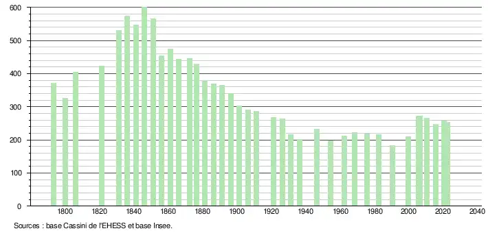 L'évolution du nombre d'habitants est connue à travers les recensements de la population effectués dans la commune depuis 1793. Pour les communes de moins de 10 000 habitants, une enquête de recensement portant sur toute la population est réalisée tous les cinq ans, les populations de référence des années intermédiaires étant quant à elles estimées par interpolation ou extrapolation[27]. Pour la commune, le premier recensement exhaustif entrant dans le cadre du nouveau dispositif a été réalisé en 2005[28].