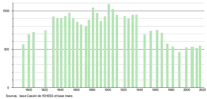 L'évolution du nombre d'habitants est connue à travers les recensements de la population effectués dans la commune depuis 1793. Pour les communes de moins de 10 000 habitants, une enquête de recensement portant sur toute la population est réalisée tous les cinq ans, les populations de référence des années intermédiaires étant quant à elles estimées par interpolation ou extrapolation[6]. Pour la commune, le premier recensement exhaustif entrant dans le cadre du nouveau dispositif a été réalisé en 2007[7].