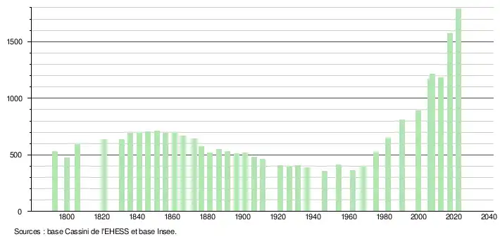 L'évolution du nombre d'habitants est connue à travers les recensements de la population effectués dans la commune depuis 1793. Pour les communes de moins de 10 000 habitants, une enquête de recensement portant sur toute la population est réalisée tous les cinq ans, les populations de référence des années intermédiaires étant quant à elles estimées par interpolation ou extrapolation[27]. Pour la commune, le premier recensement exhaustif entrant dans le cadre du nouveau dispositif a été réalisé en 2007[28].