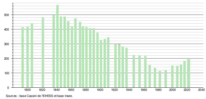 L'évolution du nombre d'habitants est connue à travers les recensements de la population effectués dans la commune depuis 1793. Pour les communes de moins de 10 000 habitants, une enquête de recensement portant sur toute la population est réalisée tous les cinq ans, les populations de référence des années intermédiaires étant quant à elles estimées par interpolation ou extrapolation[13]. Pour la commune, le premier recensement exhaustif entrant dans le cadre du nouveau dispositif a été réalisé en 2006[14].