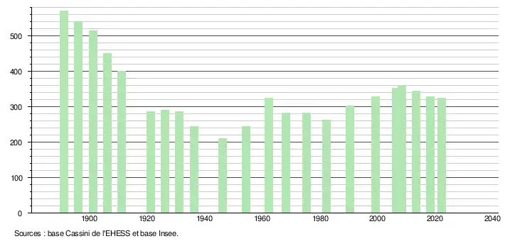 L'évolution du nombre d'habitants est connue à travers les recensements de la population effectués dans la commune depuis 1891. Pour les communes de moins de 10 000 habitants, une enquête de recensement portant sur toute la population est réalisée tous les cinq ans, les populations de référence des années intermédiaires étant quant à elles estimées par interpolation ou extrapolation[21]. Pour la commune, le premier recensement exhaustif entrant dans le cadre du nouveau dispositif a été réalisé en 2008[22].
