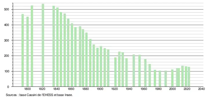 L'évolution du nombre d'habitants est connue à travers les recensements de la population effectués dans la commune depuis 1793. Pour les communes de moins de 10 000 habitants, une enquête de recensement portant sur toute la population est réalisée tous les cinq ans, les populations de référence des années intermédiaires étant quant à elles estimées par interpolation ou extrapolation[24]. Pour la commune, le premier recensement exhaustif entrant dans le cadre du nouveau dispositif a été réalisé en 2008[25].