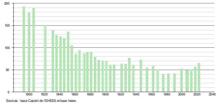 L'évolution du nombre d'habitants est connue à travers les recensements de la population effectués dans la commune depuis 1793. Pour les communes de moins de 10 000 habitants, une enquête de recensement portant sur toute la population est réalisée tous les cinq ans, les populations de référence des années intermédiaires étant quant à elles estimées par interpolation ou extrapolation[22]. Pour la commune, le premier recensement exhaustif entrant dans le cadre du nouveau dispositif a été réalisé en 2007[23].