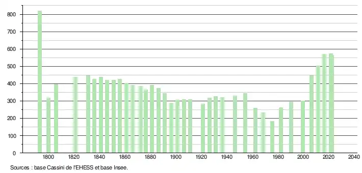 L'évolution du nombre d'habitants est connue à travers les recensements de la population effectués dans la commune depuis 1793. Pour les communes de moins de 10 000 habitants, une enquête de recensement portant sur toute la population est réalisée tous les cinq ans, les populations de référence des années intermédiaires étant quant à elles estimées par interpolation ou extrapolation[21]. Pour la commune, le premier recensement exhaustif entrant dans le cadre du nouveau dispositif a été réalisé en 2006[22].