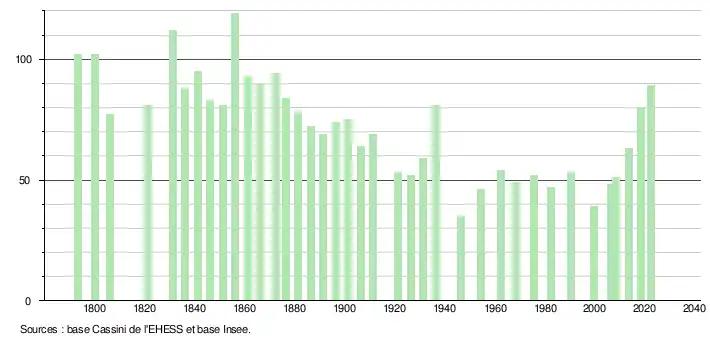 L'évolution du nombre d'habitants est connue à travers les recensements de la population effectués dans la commune depuis 1793. Pour les communes de moins de 10 000 habitants, une enquête de recensement portant sur toute la population est réalisée tous les cinq ans, les populations de référence des années intermédiaires étant quant à elles estimées par interpolation ou extrapolation[15]. Pour la commune, le premier recensement exhaustif entrant dans le cadre du nouveau dispositif a été réalisé en 2008[16].