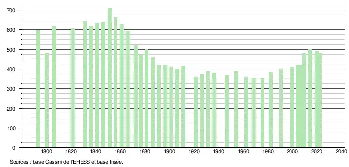 L'évolution du nombre d'habitants est connue à travers les recensements de la population effectués dans la commune depuis 1793. Pour les communes de moins de 10 000 habitants, une enquête de recensement portant sur toute la population est réalisée tous les cinq ans, les populations de référence des années intermédiaires étant quant à elles estimées par interpolation ou extrapolation[19]. Pour la commune, le premier recensement exhaustif entrant dans le cadre du nouveau dispositif a été réalisé en 2004[20].