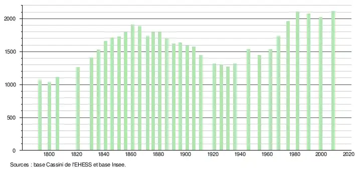 L'évolution du nombre d'habitants est connue à travers les recensements de la population effectués dans la commune depuis 1793. À partir du , les populations légales des communes sont publiées annuellement dans le cadre d'un recensement qui repose désormais sur une collecte d'information annuelle, concernant successivement tous les territoires communaux au cours d'une période de cinq ans. Pour les communes de moins de 10 000 habitants, une enquête de recensement portant sur toute la population est réalisée tous les cinq ans, les populations légales des années intermédiaires étant quant à elles estimées par interpolation ou extrapolation[9]. Pour la commune, le premier recensement exhaustif entrant dans le cadre du nouveau dispositif a été réalisé en 2008[10],[Note 2].