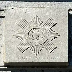 Le piédestal porte sur sa face est un bas-relief représentant des armes, surmonté de l'insigne des Scots Guards composé d'un chardon entouré de la devise Nemo me impune lacessit.