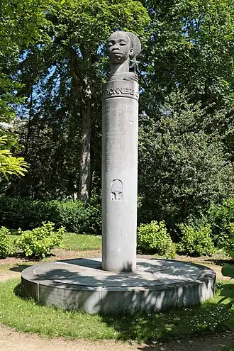 Caché dans un massif, le monument est une colonne en pierre bleue surmontée d'une sculpture en ronde-bosse figurant la tête aux lignes épurées d'une femme de l'ethnie des Mangbetu[1],[8],[6].