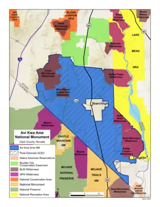 Avi Kwa Ame National Monument (prononcation /ə ˌ v iː k w ə ˈ ɑː m eɪ /[1],[2] en Mojave : ʔaviː kʷaʔame, "la plus haute montagne", de ʔaviː, "montagne, rocher ", et ʔamay, "en haut, au-dessus"[3],[4]) est un monument national américain qui protège environ 2050 km² du désert de Mojave dans le sud du Nevada. Le président Joe Biden l'a érigé en monument le 21 mars 2023[5],[6]. Il porte le nom d'Avi Kwa Ame, également connu sous le nom de Spirit Mountain, visible depuis la majeure partie du monument et considéré comme sacré en tant que site de création par les tribus Yuman[7]. La majeure partie du monument est gérée par le Bureau of Land Management dans le cadre des National Conservation Lands, et le National Park Service gère la partie située dans la zone de loisirs nationale du lac Mead[8].