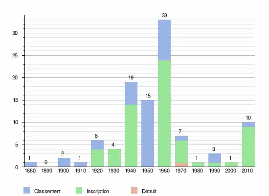 Le graphique suivant résume la chronologie des 94 actes de protection par décennies depuis 1880 :