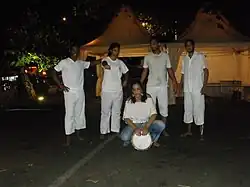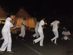 Élèves de BTS, adeptes du Moringue réunionnais lors d'une démonstration le , sur l'aire de repos de la plage de Saint-Pierre de La Réunion. Les gestuelles se rapportent aux danses tribales. | |