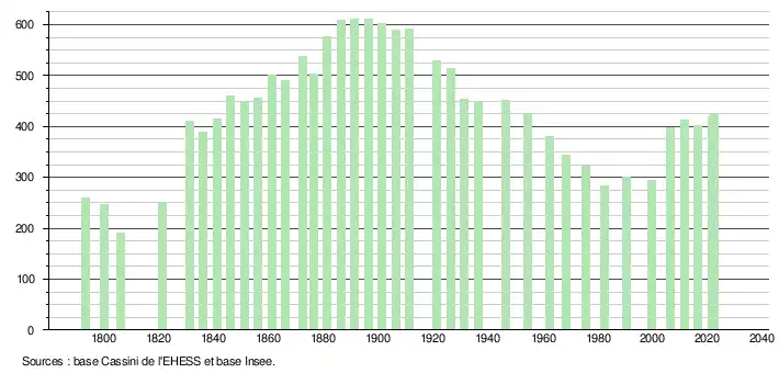 L'évolution du nombre d'habitants est connue à travers les recensements de la population effectués dans la commune depuis 1793. Pour les communes de moins de 10 000 habitants, une enquête de recensement portant sur toute la population est réalisée tous les cinq ans, les populations de référence des années intermédiaires étant quant à elles estimées par interpolation ou extrapolation[15]. Pour la commune, le premier recensement exhaustif entrant dans le cadre du nouveau dispositif a été réalisé en 2006[16].