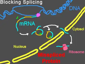 Les morpholinos peuvent interférer avec les étapes de maturation du pré-ARNm, soit en empêchant l’accouplement du complexe des petites ribonucléoprotéines nucléaires (snRNP) avec leurs cibles au bord des introns sur le brin du pré-ARNm, soit en bloquant les adénines nucléophiles, prévenant de la sorte la formation d’épissage des structures en lasso ou en interférant avec l’attachement des protéines régulatrices d’épissage telles que les « splice silencers[18] » et les « splice enhancers[19] ». Empêcher l’attachement des snRNP U1 (sur le site donneur) ou U2/U5 (à moitié sur la polypyrimidine et à moitié sur le site accepteur) peut causer des modifications d’épissage, communément l’exclusion d’exons de la maturation de l’ARNm. Cibler certaines cibles d’épissage conduit à l’exclusion de l’intron, tandis que l’activation de sites d’épissage cachés peut conduire à des inclusions ou exclusions partielles[20]. Les cibles des complexes U11/U12 snRNPs peuvent également être bloquées. La modification d'épissage peut être validée par amplification en chaîne par la polymérase après transcription inverse (RT-PCR) et se manifeste, dans un gel d'électrophorèse, par le déplacement de la bande du produit de la RT-PCR [2].