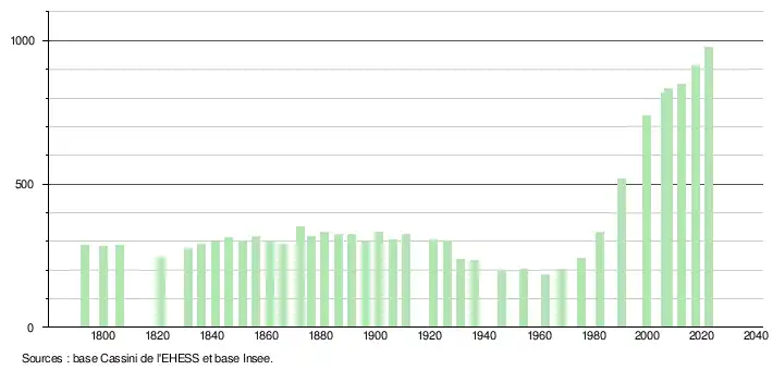 L'évolution du nombre d'habitants est connue à travers les recensements de la population effectués dans la commune depuis 1793. Pour les communes de moins de 10 000 habitants, une enquête de recensement portant sur toute la population est réalisée tous les cinq ans, les populations de référence des années intermédiaires étant quant à elles estimées par interpolation ou extrapolation[23]. Pour la commune, le premier recensement exhaustif entrant dans le cadre du nouveau dispositif a été réalisé en 2007[24].