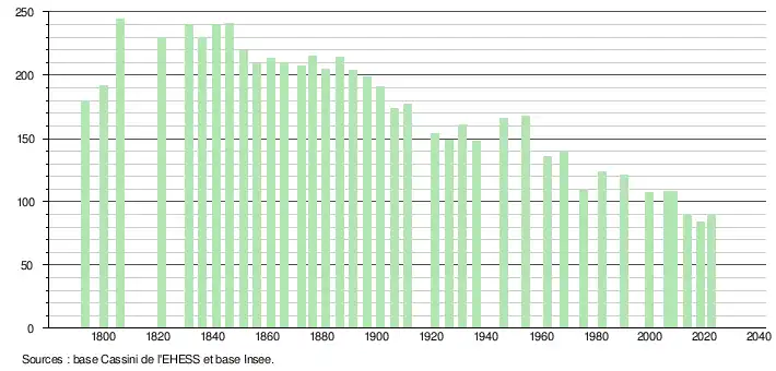 L'évolution du nombre d'habitants est connue à travers les recensements de la population effectués dans la commune depuis 1793. Pour les communes de moins de 10 000 habitants, une enquête de recensement portant sur toute la population est réalisée tous les cinq ans, les populations de référence des années intermédiaires étant quant à elles estimées par interpolation ou extrapolation[19]. Pour la commune, le premier recensement exhaustif entrant dans le cadre du nouveau dispositif a été réalisé en 2008[20].