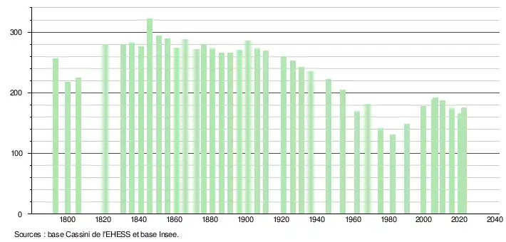 - ↑ Fiches Insee - Populations de référence de la commune pour les années 2006, 2007, 2008, 2009, 2010, 2011, 2012, 2013, 2014, 2015, 2016, 2017, 2018, 2019, 2020, 2021 et 2022.