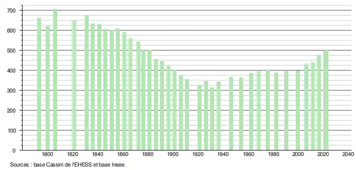 L'évolution du nombre d'habitants est connue à travers les recensements de la population effectués dans la commune depuis 1793. Pour les communes de moins de 10 000 habitants, une enquête de recensement portant sur toute la population est réalisée tous les cinq ans, les populations de référence des années intermédiaires étant quant à elles estimées par interpolation ou extrapolation[25]. Pour la commune, le premier recensement exhaustif entrant dans le cadre du nouveau dispositif a été réalisé en 2006[26].