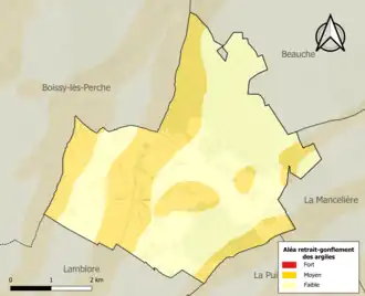 Le retrait-gonflement des sols argileux est susceptible d'engendrer des dommages importants aux bâtiments en cas d’alternance de périodes de sécheresse et de pluie. 40,5 % de la superficie communale est en aléa moyen ou fort (52,8 % au niveau départemental et 48,5 % au niveau national). Sur les 105 bâtiments dénombrés sur la commune en 2019, 42 sont en aléa moyen ou fort, soit 40 %, à comparer aux 70 % au niveau départemental et 54 % au niveau national. Une cartographie de l'exposition du territoire national au retrait gonflement des sols argileux est disponible sur le site du BRGM[18],[Carte 2].