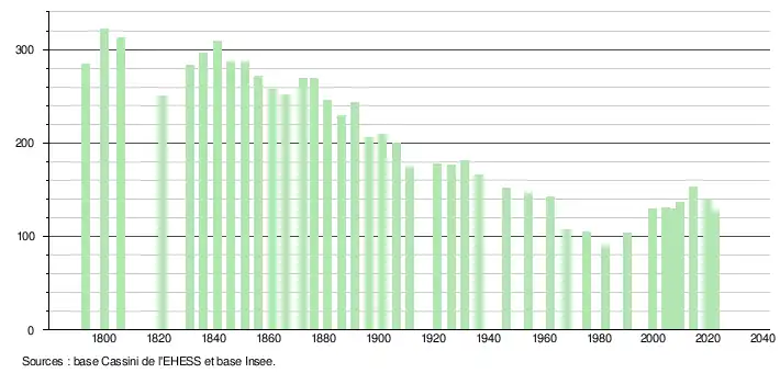L'évolution du nombre d'habitants est connue à travers les recensements de la population effectués dans la commune depuis 1793. Pour les communes de moins de 10 000 habitants, une enquête de recensement portant sur toute la population est réalisée tous les cinq ans, les populations de référence des années intermédiaires étant quant à elles estimées par interpolation ou extrapolation[24]. Pour la commune, le premier recensement exhaustif entrant dans le cadre du nouveau dispositif a été réalisé en 2004[25].
