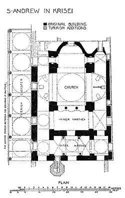 Il est difficile de retrouver le plan original de l’église en raison des modifications apportées lors de sa transformation en mosquée et des rénovations qui suivirent le tremblement de terre de 1765[9]. Son axe va de l’est-nord-est vers l’ouest-sud-ouest. Au centre se trouve un *dôme[N 1] flanqué de trois *absides à l’est, d’un *esonarthex et d’un *exonarthex à l’ouest. Sur trois de ses côtés, le *dôme central était entouré d’*arcs surmontés de *voutes en berceau. Lors de la transformation en mosquée, on transféra l’entrée sur le côté nord où les Ottomans construisirent une *arcade de style turc. Le *mihrab se trouve sur le côté sud, permettant aux fidèles de prier en direction de La Mecque. Du côté est, on a ajouté une salle dans laquelle se regroupent les femmes durant la prière; du côté ouest se trouve une autre salle où les *derviches du *tékké attenant à la mosquée tenaient leurs réunions. L’aile nord a également été structuralement modifiée et a été surmontée de *dômes de style turc[9].