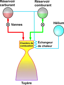 Il s'agit de la plus simple des configurations de moteurs-fusées à ergols liquides, ne nécessitant pas de turbopompes. Elle permet d'obtenir des moteurs particulièrement fiables, mais à la poussée modeste et au rendement faible[1].