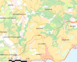À partir du 22 juin 1854, une partie du territoire (400 hectares) de Mougins est rattachée au Cannet[15], il s'agit là principalement des zones limitrophes Nord du Cannet comprenant entre autres, les quartiers moderne ou ancien des Fades, du Colombier, des Campelières, la Blanchisserie des Moulières, de l'Aubarède, de Ranguin, des Claus, du Piccolaret, Font Gallou, Les Escarasses, Les bréguières. Les autres parties sont les territoires de la commune de Cannes qui se sont séparés de cette dernière pour former la commune du Cannet.
