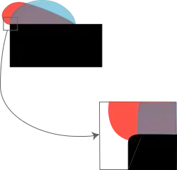 Un cas simple qui conduit à cette situation d'ancrage est celui où la ligne de contact se trouve sur une arête vive, par exemple au bord d'une plaque solide. Dans ce cas, l'orientation de la surface solide varie sur des distances courtes. Vu de loin, l'angle de contact varie entre deux valeurs extrêmes sans que la ligne de contact ne bouge. Vu de près, l'angle de contact est en réalité toujours égal à sa valeur habituelle : la ligne de contact se déplace en fait très légèrement pour que l'orientation locale de la surface solide s'adapte à la nouvelle orientation de l'interface gaz/liquide. Ceci est illustré sur la figure ci-contre.
