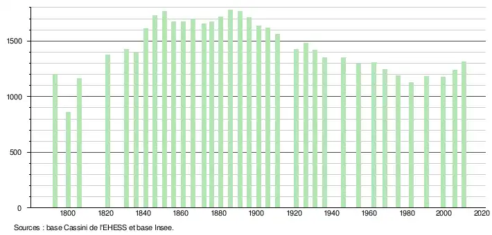 L'évolution du nombre d'habitants est connue à travers les recensements de la population effectués dans la commune depuis 1793. À partir du , les populations légales des communes sont publiées annuellement dans le cadre d'un recensement qui repose désormais sur une collecte d'information annuelle, concernant successivement tous les territoires communaux au cours d'une période de cinq ans. Pour les communes de moins de 10 000 habitants, une enquête de recensement portant sur toute la population est réalisée tous les cinq ans, les populations légales des années intermédiaires étant quant à elles estimées par interpolation ou extrapolation[10]. Pour la commune, le premier recensement exhaustif entrant dans le cadre du nouveau dispositif a été réalisé en 2005[11],[Note 2].