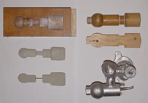 - Dans le cas de la restauration de pièces de fonderie, par exemple, on peut utiliser la pièce à restaurer comme modèle, cette méthode dite de contre moulage, permet d'obtenir une pièce "neuve", mais de dimensions légèrement inférieures à celles de l'original (environ 12 pour mille dans le cas de l'aluminium) à cause du retrait. D'autre part, la pièce destinée à servir de modèle doit être "habillée", c’est-à-dire que l'on va remettre de l'épaisseur (résine, carton collé, etc.) sur les zones destinées à être usinées.